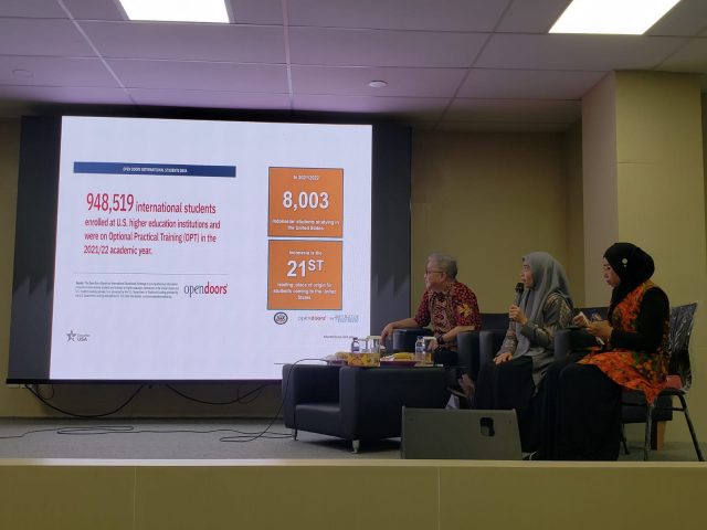 Lilis Su’adah, MA dalam paparan materinya menyampaikan beberapa informasi beasiswa ke Amerika Serikat. Bukan hanya beasiswa untuk S2 dan S3 namun ia memberikan informasi program belajar jangka pendek untuk mahasiswa seperti program YSEALI, SUSI, dan YES Program. Ibu Lilis juga memberikan tawaran agar mahasiswa atau dosen membuat group pemburu beasiswa agar ia dapat terus memberikan mentorship gratis. Ia bahkan bersedia untuk memberikan bimbingan menulis esay beasiswa yang tentu juga tidak berbayar.